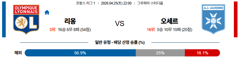 04월25일 오세르:리옹 리그앙 분석 및 예측 스포츠중계:스포츠무료중계