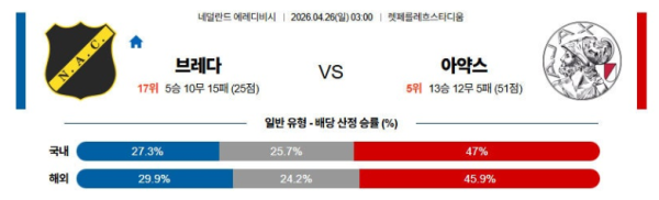 04월26일 브레다 : 아약스 에레데비시 분석 및 예측 스포츠중계,스포츠분석