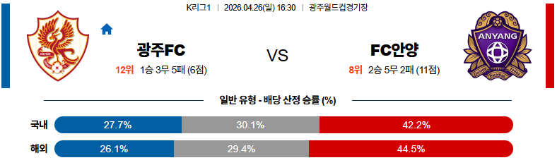 04월26일 광주 : 안양 K리그1 분석 및 예측 스포츠중계,스포츠분석