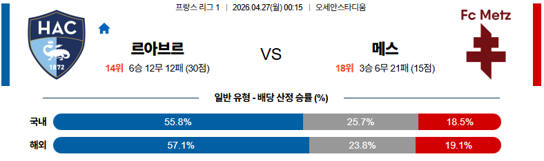 04월27일 르아브르:메스 리그앙 분석 및 예측 스포츠중계:스포츠무료중계