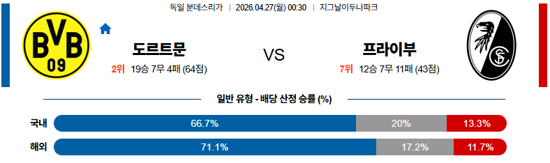 04월27일 도르트문트:프라이부르크 분데스리가 분석 및 예측 스포츠중계:스포츠무료중계
