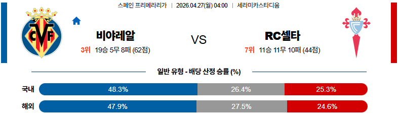 04월27일 비야레알:셀타비고 라리가 분석 및 예측 스포츠중계:스포츠무료중계