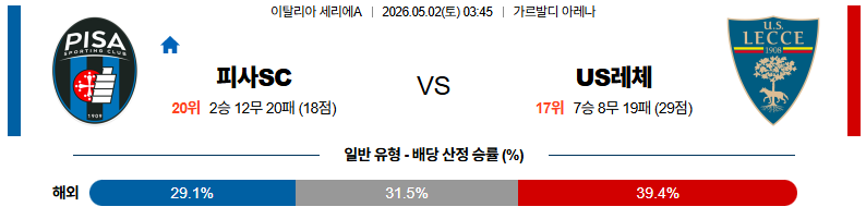 05월02일 피사SC:US레체 세리에A 분석 및 예측 스포츠중계:스포츠무료중계