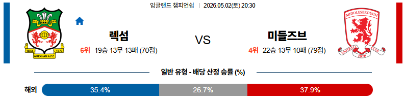 05월02일 렉섬:미들즈브러 잉글랜드챔피언쉽 분석 및 예측 스포츠중계:스포츠무료중계