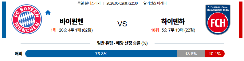 05월02일 바이에른뮌헨:하이덴하임 분데스리가 분석 및 예측 스포츠중계:스포츠무료중계