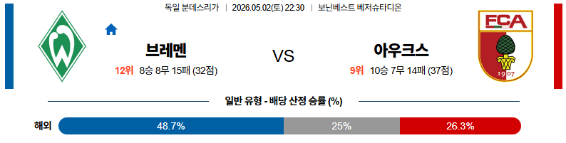 05월02일 브레멘:아우크스부르크 분데스리가 분석 및 예측 스포츠중계:스포츠무료중계