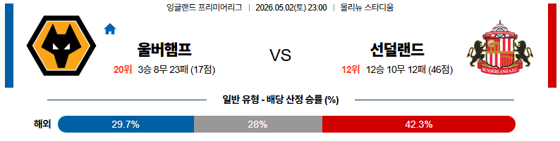 05월02일 울버햄튼:선덜랜드 프리미어리그 분석 및 예측 스포츠중계:스포츠무료중계