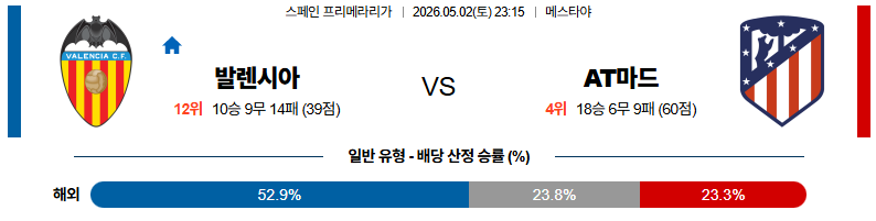 05월02일 발렌시아:AT마드리드 라리가 분석 및 예측 스포츠중계:스포츠무료중계
