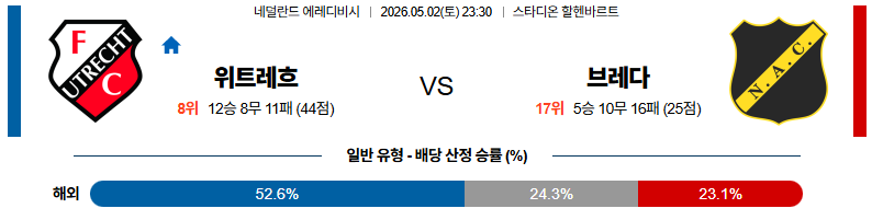 05월02일 위트레흐트:브레다 에레디비지 분석 및 예측 스포츠중계:스포츠무료중계