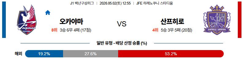 05월02일 산프레체히로시마:오카야마 J리그백년구상리그 분석 및 예측 스포츠중계:스포츠무료중계