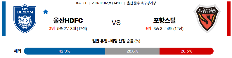 05월02일 울산HD:포항 K리그1 분석 및 예측 스포츠중계:스포츠무료중계