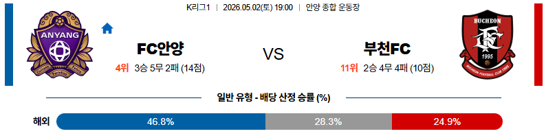 05월02일 안양:부천 K리그1 분석 및 예측 스포츠중계:스포츠무료중계